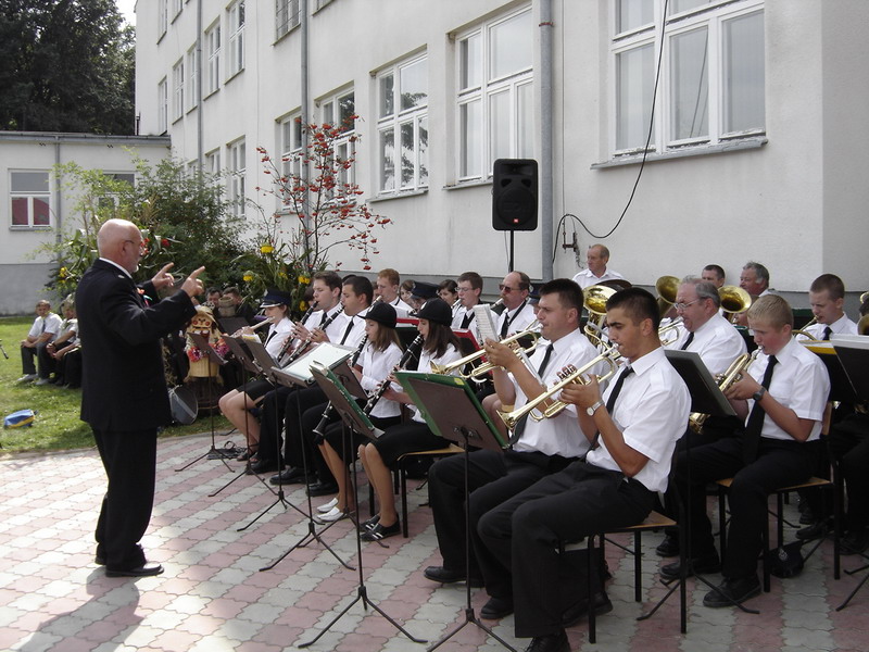 uroczystym pochodem z towarzyszeniem orkiestry strażackiej pod pomnik